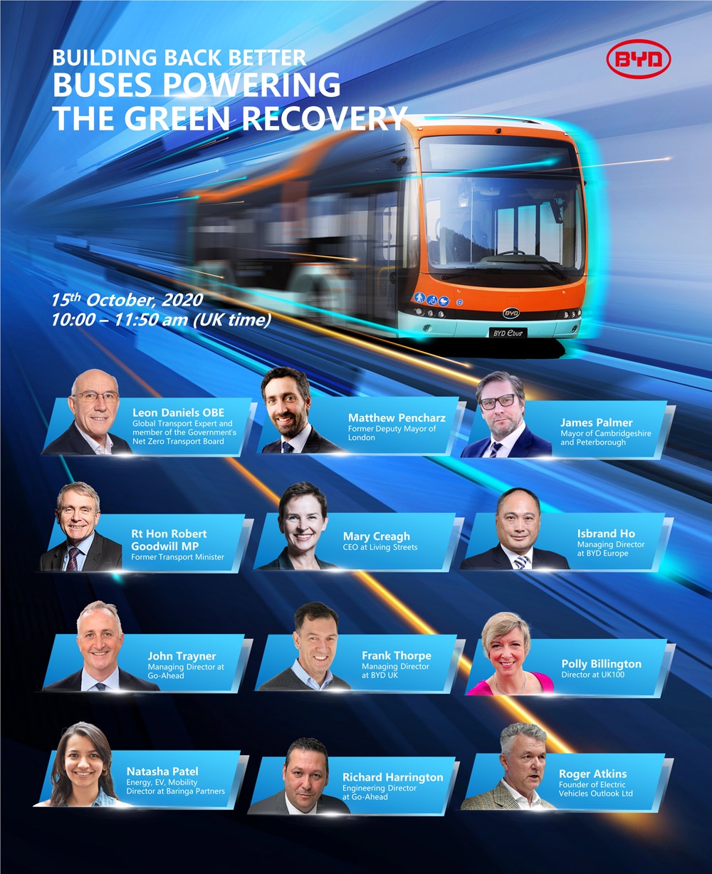 BYD (UK) Ltd. – the British subsidiary of BYD, the world’s leading electric bus manufacturer – has today hosted a panel of key stakeholders from UK government and British industry at an important Webinar entitled, ‘Building Back Better: Buses Powering the Green Recovery’, supported by UK100, UK’s leading network of local government leaders .